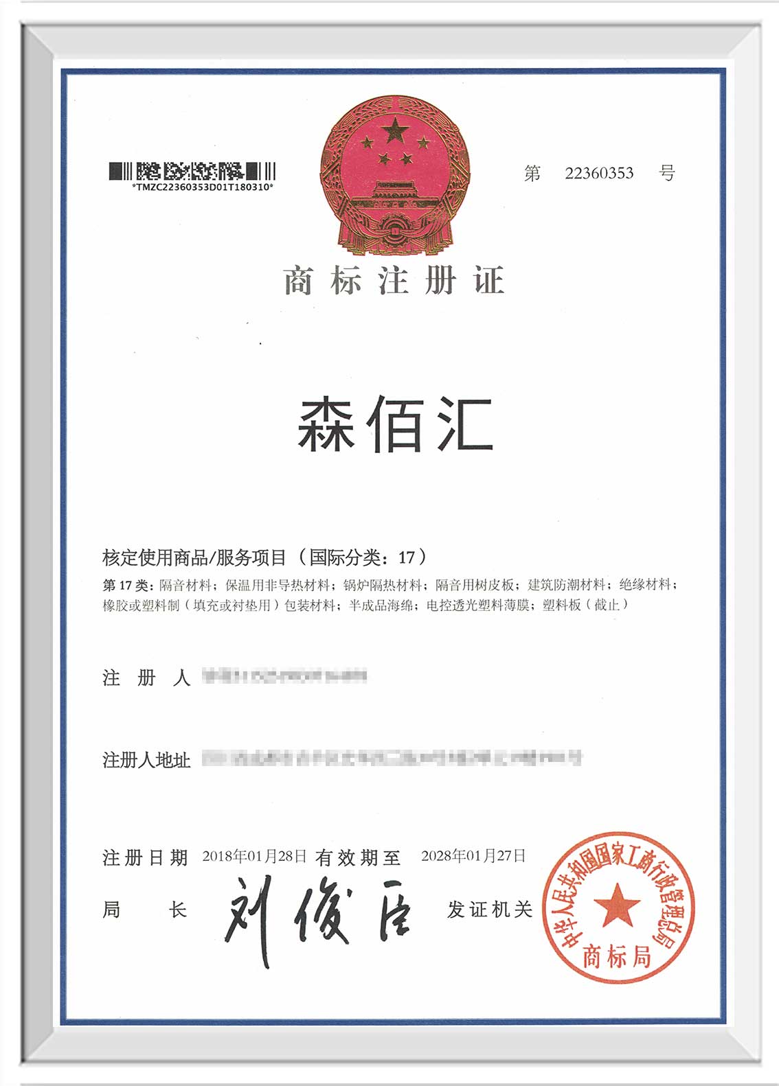 金华“森佰汇”商标证书下发至企业